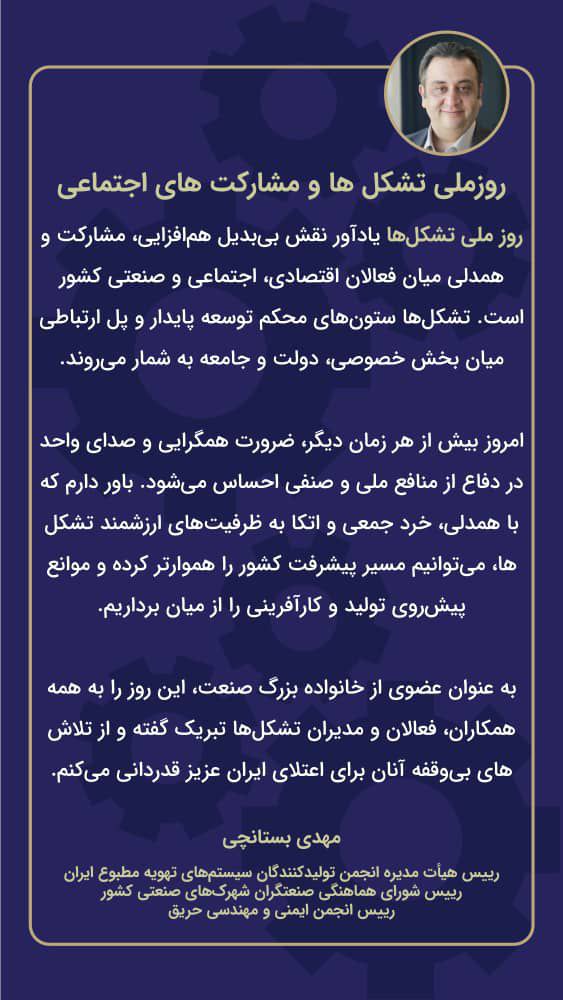 به عنوان عضوی از خانواده بزرگ صنعت، این روز را به همه همکاران، فعالان و مدیران تشکلها تبریک گفته و از تلاشهای بیوقفه آنان برای اعتلای ایران عزیز قدردانی میکنم.
